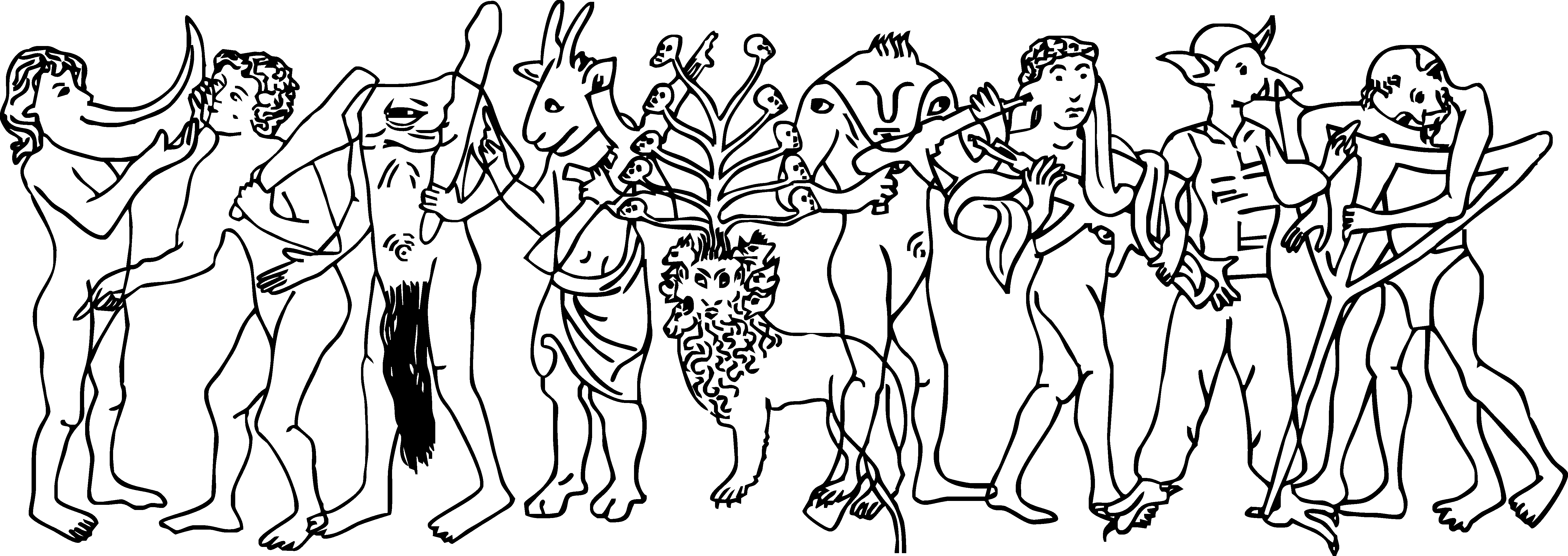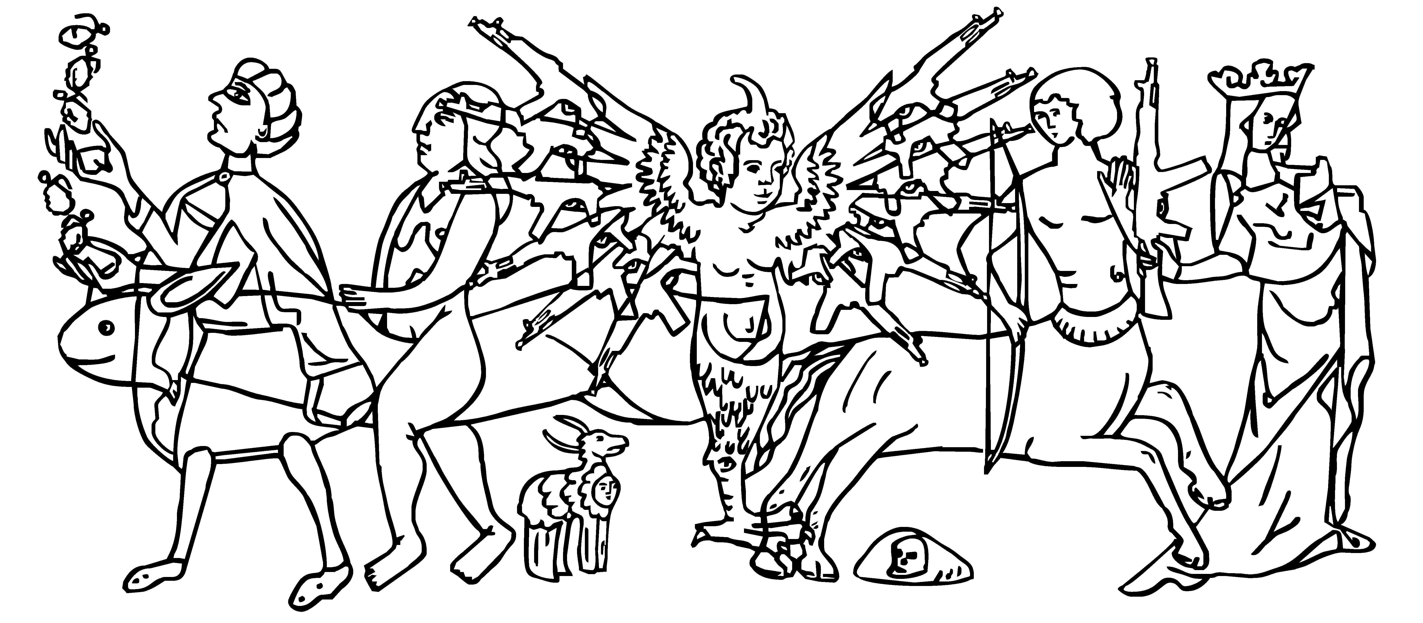 The Morphology of War was conceived in 2017 as a project of large-scale digital murals. It focuses on the idea that each society gives birth to its own monsters. In a time of war and under the influence of propaganda, they procreate. Friends change their form and become enemies-unfamiliar, grotesque, and potentially dangerous. They experience severe morphological changes. This project reflects the ugliness of Russian military aggression and the initial hybrid warfare that distorted the image of the “other.” It is also an exploration of how deeply destructive instincts are rooted in visual culture, using images from medieval bestiaries and beyond. The continuous line of monsters is reminiscent of the symbolism of the danse macabre taken by Ingmar Bergman for the conclusion of his film The Seventh Seal.